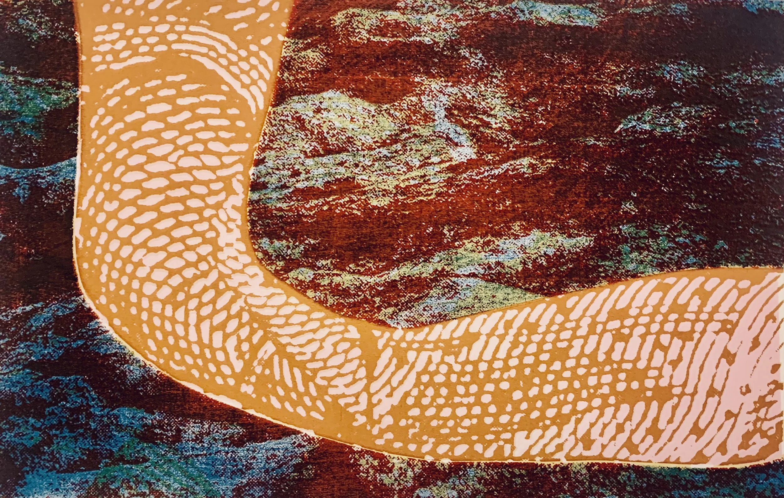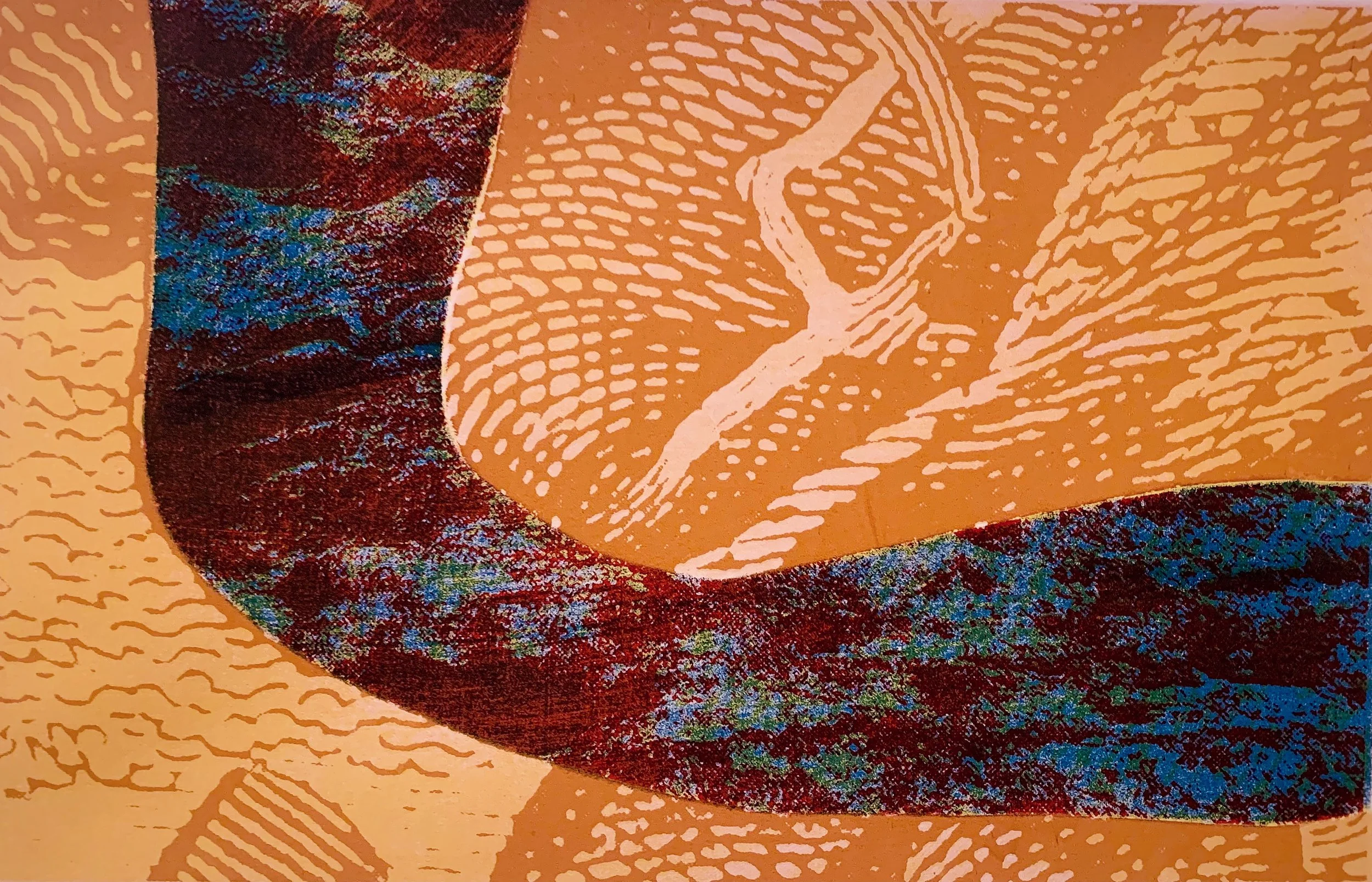 Relief and silkscreen prints on abaca, flax, and turmeric dyed hand-made paper, each 10” X 10”. This series explores the Western European use of women as allegories for lands seized for colonization.